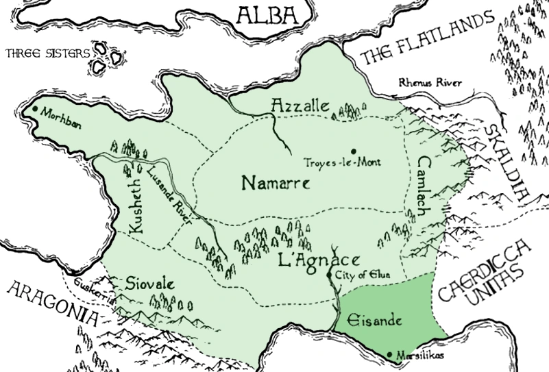 Eisande is the southernmost province of Terre d'Ange. It was founded by Eisheth and contains the city of Marsilikos, one of the most important cities in Terre d'Ange. Eisandines are often gifted in music and storytelling. The finest chirurgeons are said to come from Eisande. Mendacants, traveling storytellers, hail from there. The province is also home to a large Tsingani population that is better-tolerated there than in the rest of Terre d'Ange.
